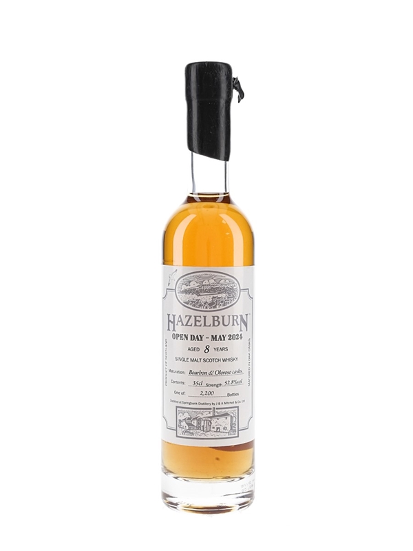 A 35cl bottle of Hazelburn 8 Year Old Single Malt Scotch Whisky, released to coincide with Springbank Distillery Open Day 2024. This was matured in bourbon and oloroso casks.