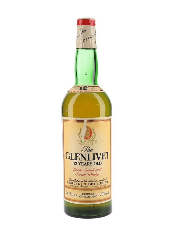 A bottle of Glenlivet 12 Year Old Unblended All Malt Scotch whisky, distilled and bottled in Scotland by George & J G Smith Limited, The Glenlivet Distillery. We estimate this was bottled in the 1970s.