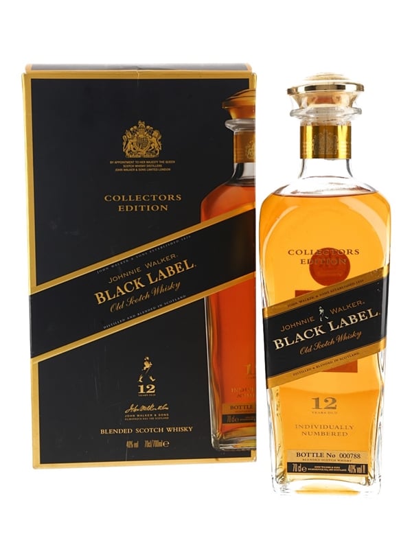A bottle of Johnnie Walker 12 Year Old Black Label Collectors Edition Old Scotch Whisky, presented in an individually numbered decanter.