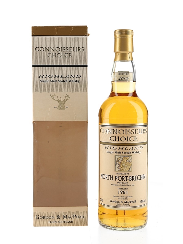 A bottle of North Port-Brechin Single Highland Malt Scotch Whisky. This was distilled in 1981 and bottled by Gordon & MacPhail for the Connoisseurs Choice range in 2006.