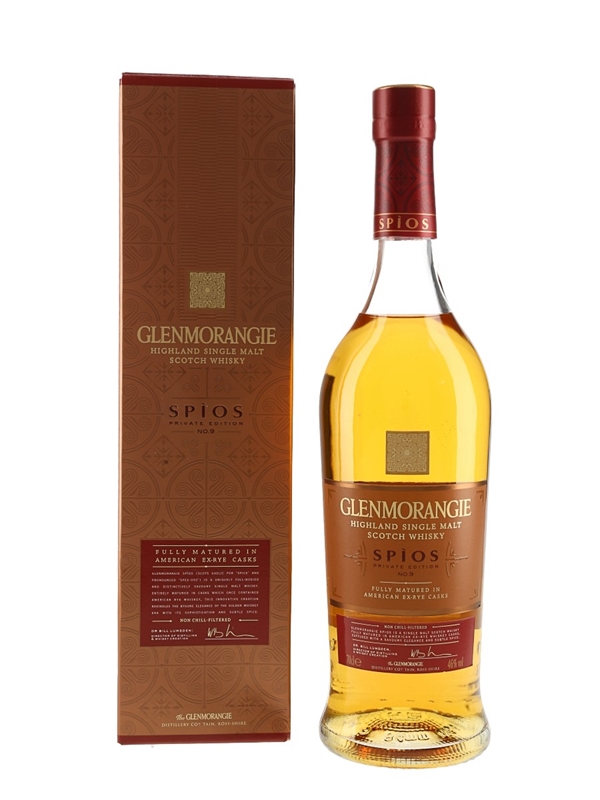 A bottle of Glenmorangie Spios Highland Single Malt Scotch Whisky, the ninth release in the Private Edition series. Spios is Gaelic for 'spice' and this is the first single malt to have been entirely matured in American rye whiskey casks.