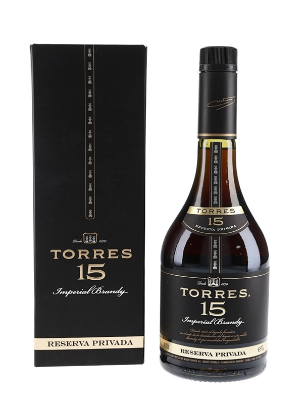 A bottle of Torres 15 Year Old Reserva Privada Imperial brandy distilled and bottled in Spain by Miguel Torres in Vilafranca Del Penedes.