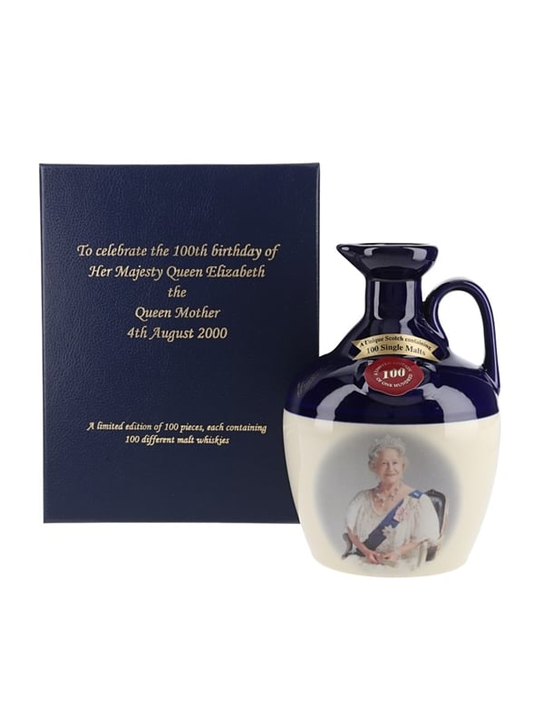 A bottle of Rutherford's Blended Malt Scotch Whisky presented in a ceramic Montrose Pottery decanter to celebrate the 100th birthday of the Queen Mother in August 2000. The blend is made up of a hundred different Malt Scotch Whiskies.