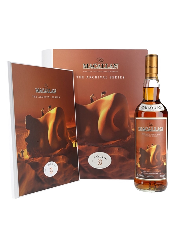 A bottle of The Macallan The Archival Series Folio Eight. This is the eighth chapter in The Archival Series, sold with a commemorative book all within a book-shaped presentation box.