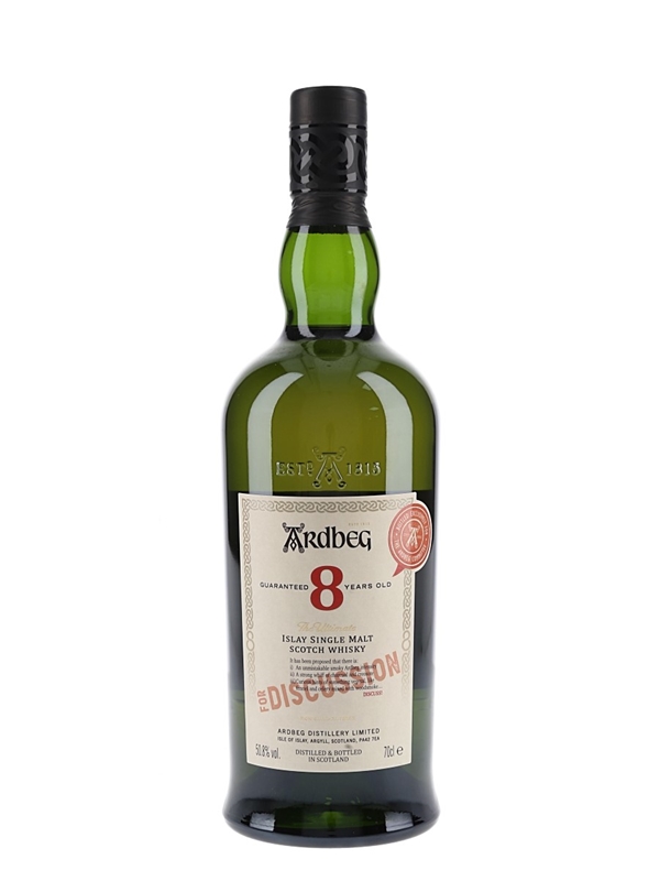 A bottle of Ardbeg 8 Year Old The Ultimate Islay Single Malt Scotch Whisky bottled at 50.8% ABV. This is an intense, smoky whisky with notes of charcoal and creosote and described by Ardbeg to be 'deliberately challenging'.