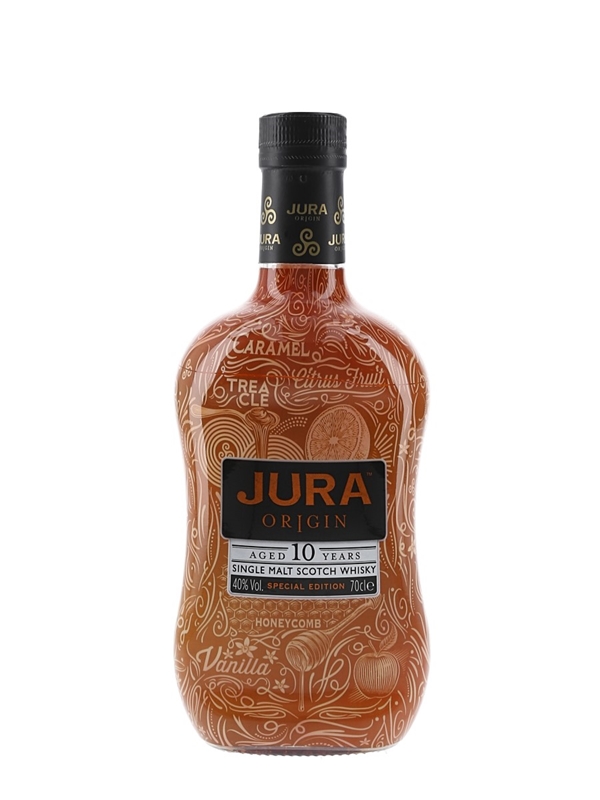 A special edition bottle of Jura Origin 10 Year Old Single Malt Scotch Whisky from the Isle of Jura. This presentation celebrates the aromas and flavours of Jura Origin.