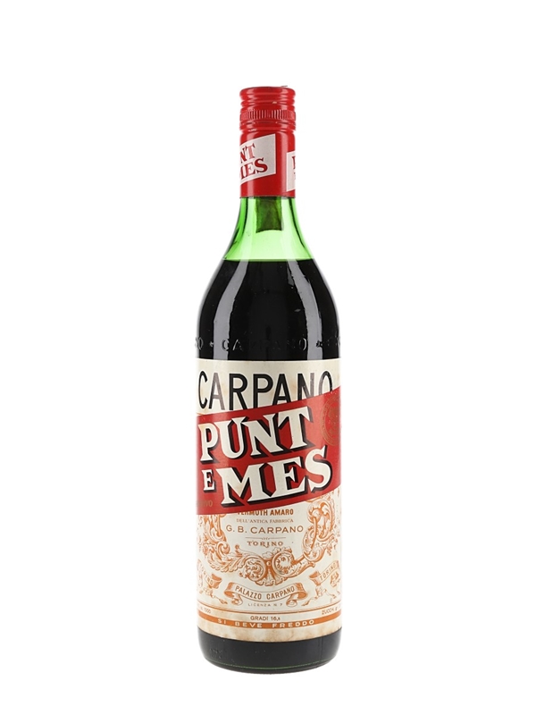 A litre bottle of Punt E Mes, the famously bitter red wine vermouth produced by Carpano in Turin, Italy. We estimate this was bottled in the 1970s.