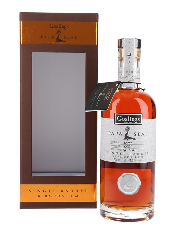 A bottle of Goslings Papa Seal Single Barrel Rum, produced in Bermuda and bottled at 41.5% ABV in 2021.