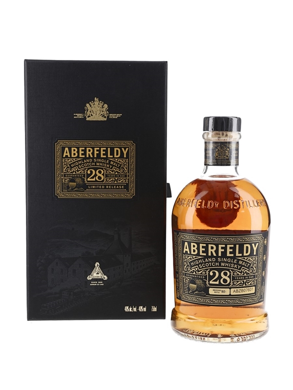 A limited release bottle of Aberfeldy 28 Year Old Single Malt Scotch Whisky.