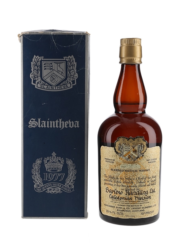 A bottle of Slaintheva Blended Scotch Whisky, blended and bottled by Alexander Dunn & Co. and released to commemorate the Queen's Silver Jubilee in 1977.