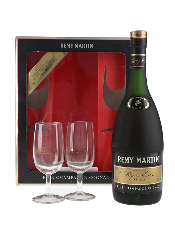 A bottle of Rémy Martin VSOP Fine Champagne Cognac with two Cellarmaster glasses. We estimate this was bottled in the late 1980s to early 1990s.