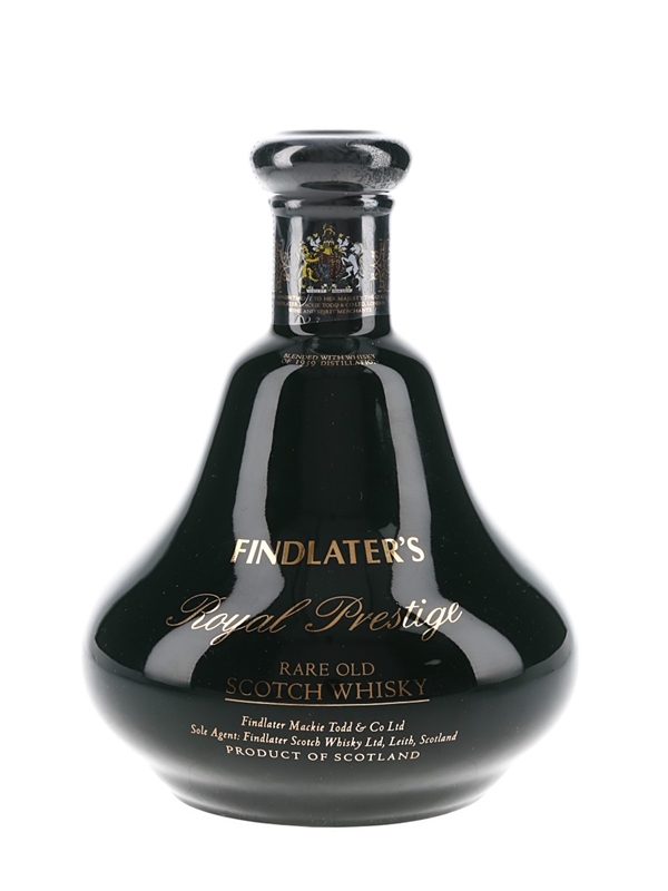 A bottle of Findlater's Royal Prestige Rare Old Scotch Whisky presented in a green Wade porcelain decanter.