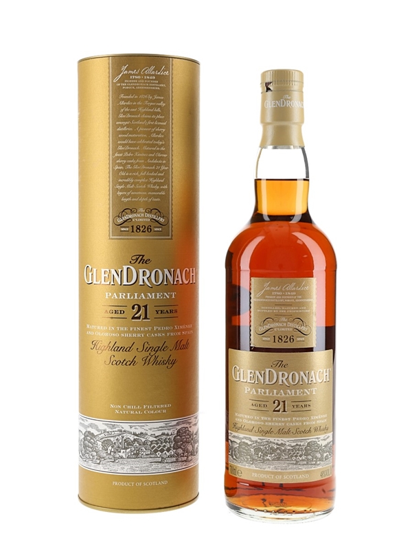 A bottle of The Glendronach 21 Year Old Highland Single Malt Scotch Whisky, named for the Parliament of rooks that live near the distillery. This was matured in a combination of oloroso and Pedro Ximénez sherry casks, and bottled at 48% ABV.