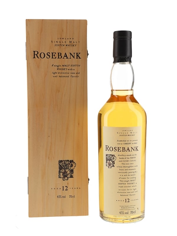 A bottle of Rosebank 12 Year Old Lowland Single Malt Scotch Whisky, bottled for Diageo's Flora & Fauna collection.