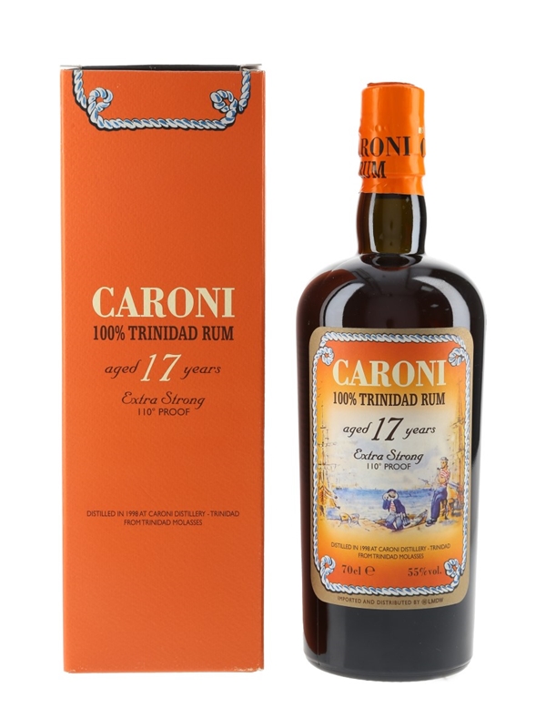 A bottle of Caroni 17 Year Old Extra Strong Trinidad Rum. This was distilled in 1998 and bottled in November 2015 for Velier. The label is a reproduction of an original from 1940, chosen to commemorate the golden age of Trinidad rum.