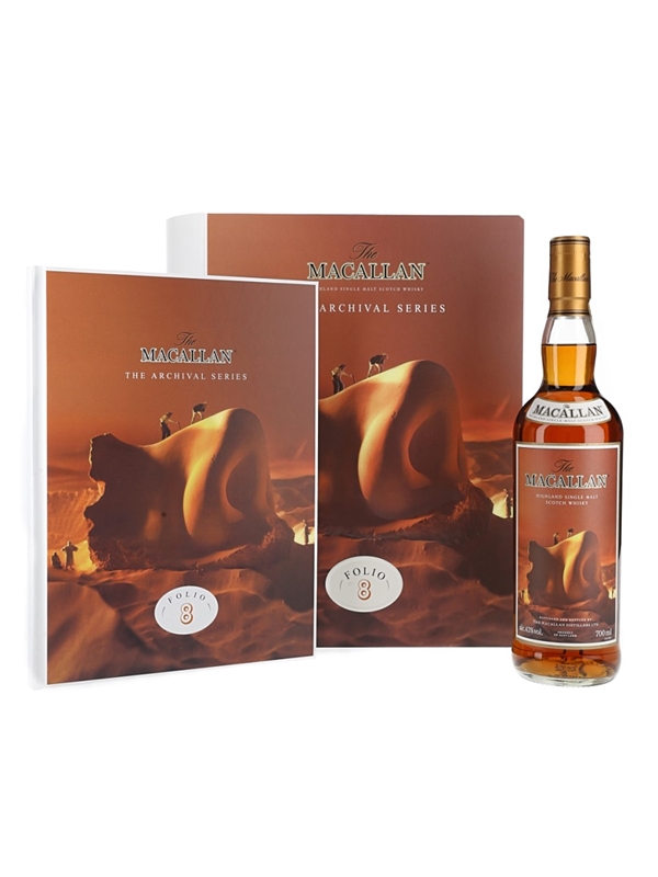 A bottle of The Macallan The Archival Series Folio Eight. This is the eighth chapter in The Archival Series, sold with a commemorative book all within a book-shaped presentation box.