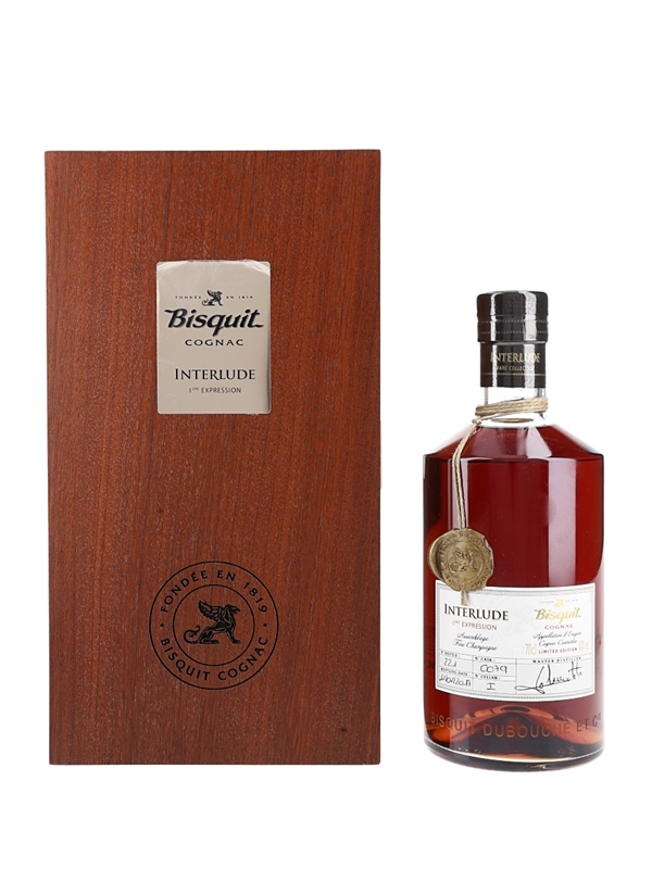 A bottle of Bisquit Dubouche Interlude 1ere Expression Cognac, a blend of very old eaux-de-vie from the Grande and Petite Champagne growing regions.This was bottled on the 11 January 2017.