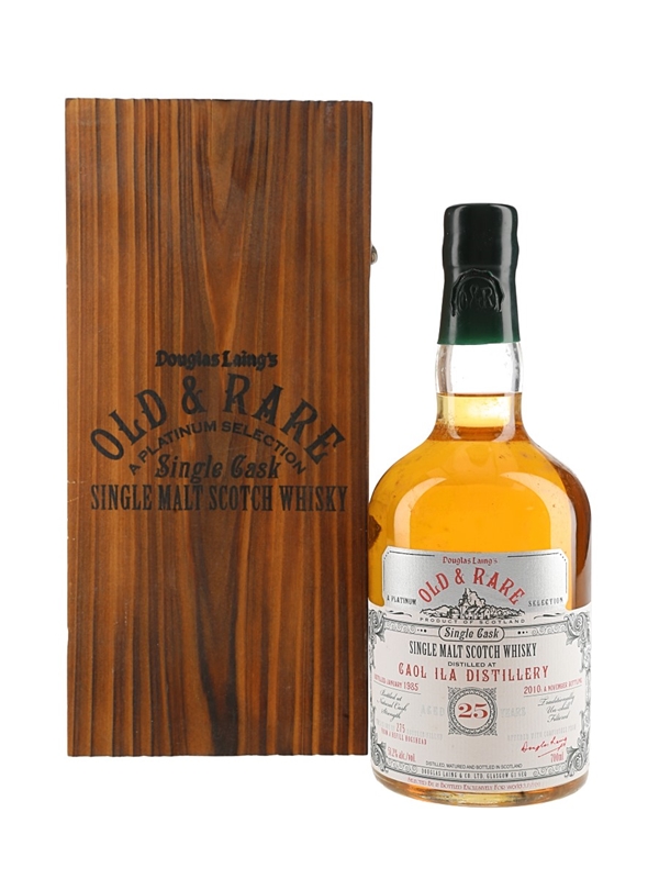 A bottle of Caol Ila 25 Year Old Single Malt Scotch Whisky. This was distilled in January 1985, matured in a single cask, and bottled at natural cask strength in November 2010 by Douglas Laing for the Old & Rare Platinum Selection.