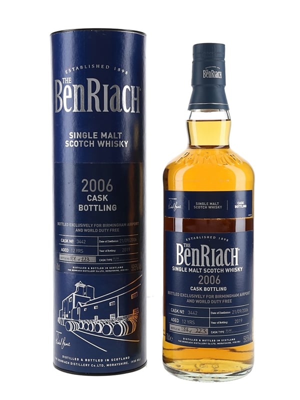 A bottle of Benriach 12 Year Old Single Malt Scotch Whisky. This was distilled on 21 September 2006, matured in a rum cask and bottled in 2019 exclusively for Birmingham Airport and World Duty Free.