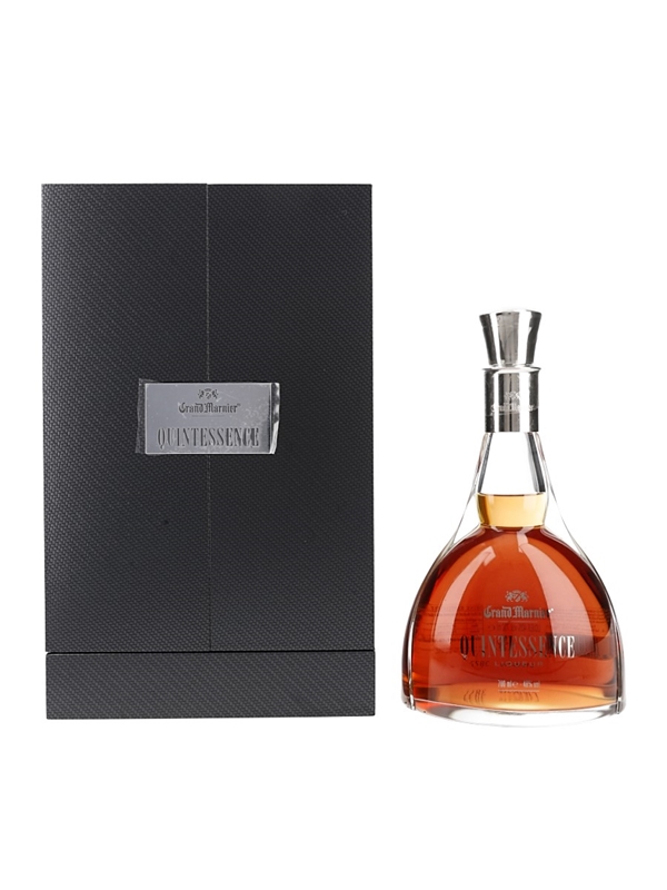 A bottle of Grand Marnier Quintessence. A very limited edition Grand Marnier, based on Grande Champagne Cognac aged between 25 and 135 years, including the 1875, 1906 and 1955 vintages, and using their 'double parfum' method of extracting the flavour from orange peels.