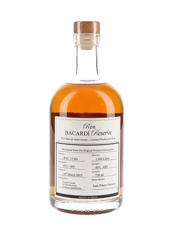 A bottle of Bacardi Reserve rum, 2015 Special Anniversary produced in Mexico by Juan Pinera Guevara Master Blender. This was bottled on 16 March 2015 at 40% ABV.