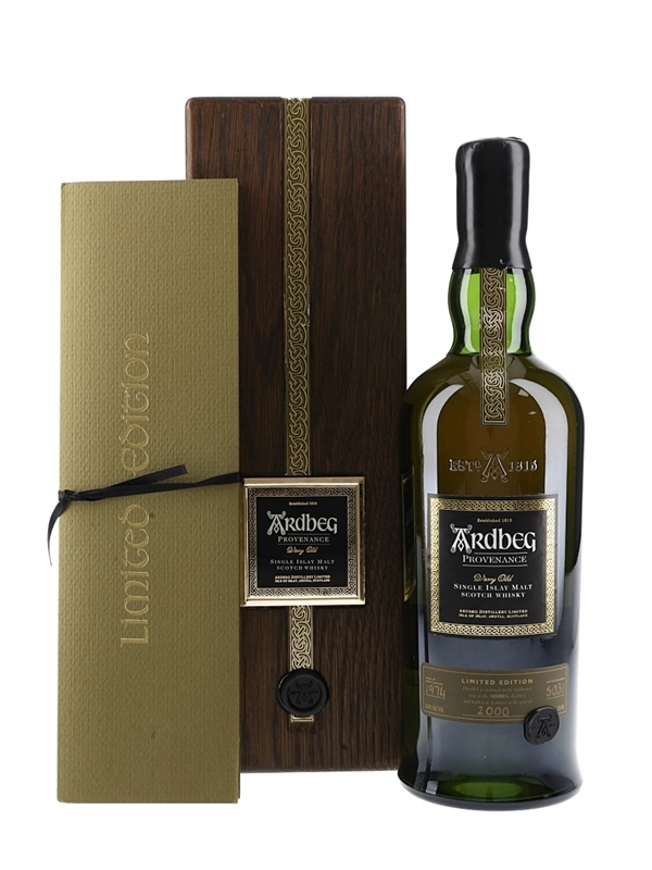 A bottle of Ardbeg Provenance Very Old Single Islay Malt Scotch Whisky. This was distilled in 1974, one of the last years that Ardbeg's maltings were fully operational, and bottled on 18 November 1997 at cask strength of 55% ABV.