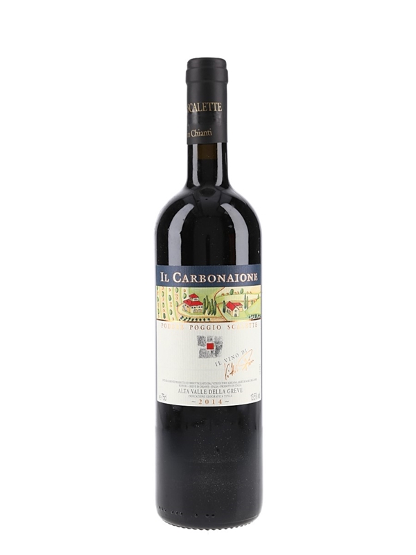 A bottle of 2014 Il Carbonaione from Podere Poggio Scalette and bottled by Viticoltore Adriana Assie. Il Carbonaione is a single-vineyard expression of Sangiovese from 80-year-old vines.