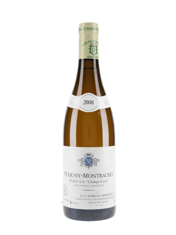 A bottle of 2008 Puligny-Montrachet Champs-Canet from Domaine Ramonet, harvested from a 0.33 ha parcel. The vineyard's name comes from a historic owner, Monsieur Canet.