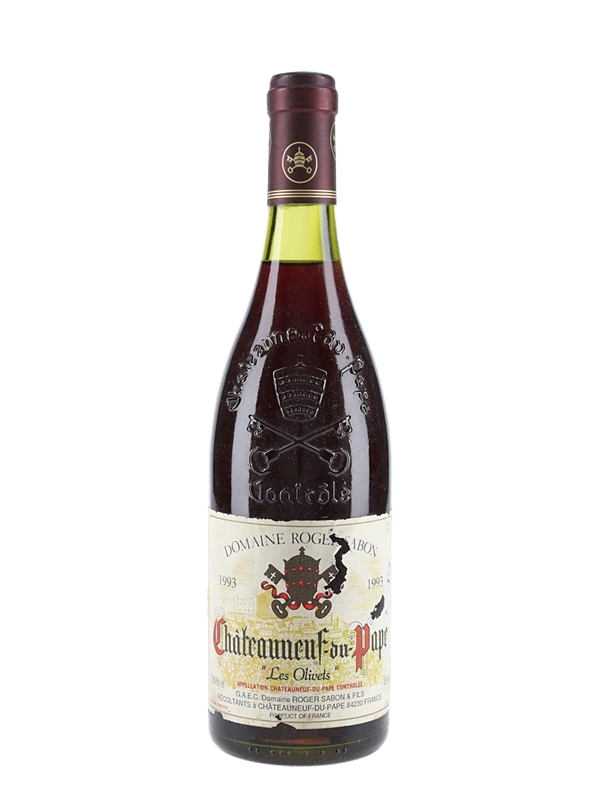 A bottle of 1993 Châteauneuf du Pape Les Olivets bottled by Domaine Roger Sabon from the Southern Rhône's most celebrated appellation.