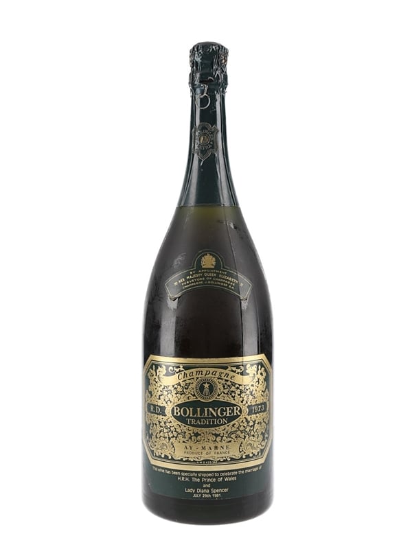 A magnum bottle of 1973 Bollinger RD Tradition Brut Champagne, bottled on 30 March 1981, specially shipped to celebrate the marriage of H.R.H. The Prince of Wales and Lady Diana Spencer on 29th July 1981.