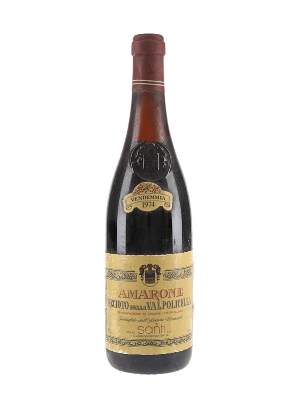 A bottle of 1974 Santi Amarone Recioto Della Valpolicella, a full-bodied red wine made from partially dried Corvina, Rondinella and Molinara grapes.