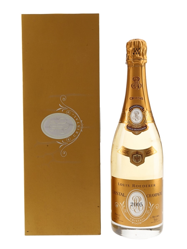 A bottle of Louis Roederer Cristal from the 2005 vintage, a blend of 55% Pinot Noir and 45% Chardonnay. This comes in a wooden presentation box.