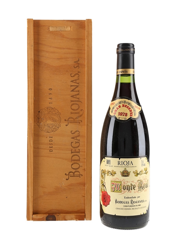 A bottle of 1978 Monte Real Gran Reserva Rioja, bottled by Bodegas Riojanas.