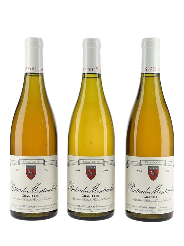 This lot contains three bottles of 2004 Bâtard-Montrachet Grand Cru Reserve Francois Labet, bottled by Henri Darnat in France.