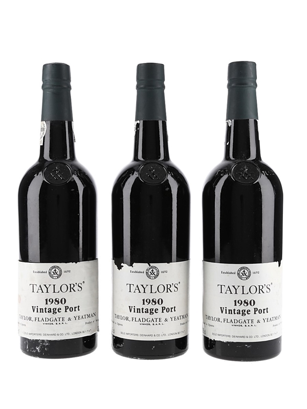 This lot contains 3 bottles of Taylors 1980 Vintage Port, shipped and bottled by Taylor, Fladgate & Yeatman and imported into the UK by Deinhard & Co. Ltd., London, SE1.