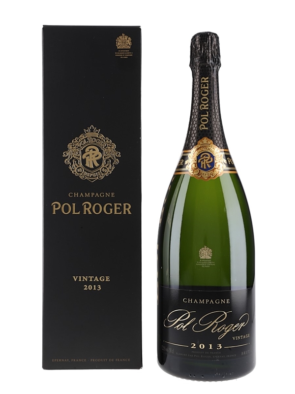 A magnum bottle of 2013 Pol Roger Brut Champagne produced exclusively from Chardonnay grapes grown in Grand Cru villages in the Côte des Blancs: Le Mesnil, Avize, Cramant, Chouilly, Oiry and Oger.