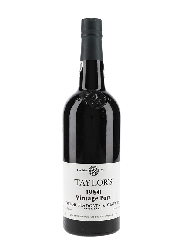 A bottle of Taylors 1980 Vintage Port, shipped and bottled by Taylor, Fladgate & Yeatman and imported into the UK by Deinhard & Co. Ltd., London, SE1.