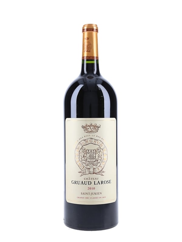 A Magnum bottle of 2010 Château Gruaud-Larose from Bordeaux's Saint-Julien appellation. The property was ranked as a Grand Cru Classé in the 1855 Classification, and its 82 hectares are planted with 57% Cabernet Sauvignon, 31% Merlot, 7.5% Cabernet Franc, 3% Petit Verdot and 1.5% Malbec.