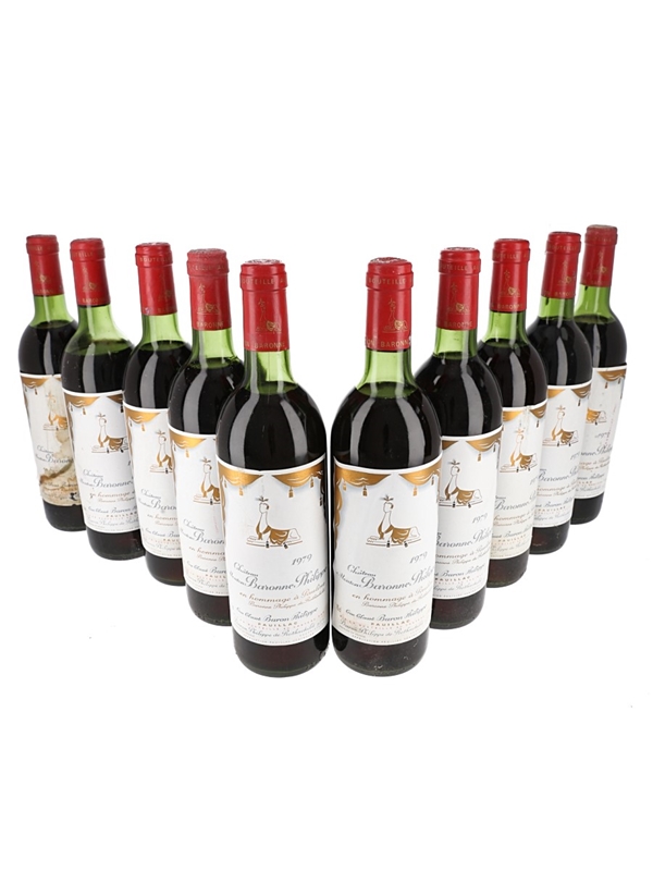 This lot contains 10 bottles of 1979 Château Mouton Baronne Philippe from Bordeaux's Pauillac appellation.