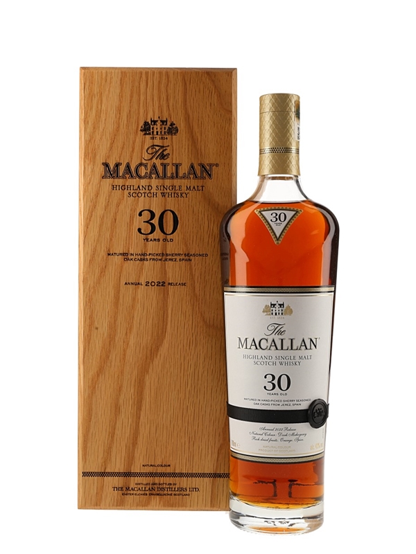 A bottle of The Macallan 30 Year Old Highland Single Malt Scotch Whisky, exclusively matured in sherry seasoned oak casks from Spain. This is the annual 2022 release.