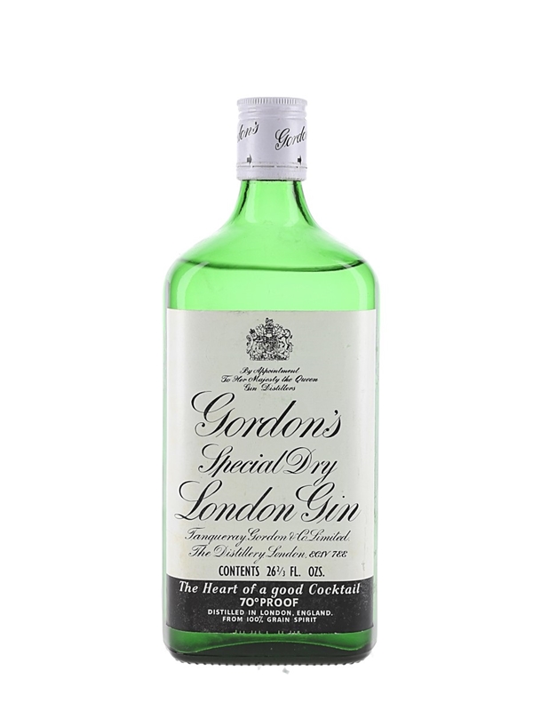 A bottle of Gordon's Special Dry London Gin, distilled and bottled by Tanqueray, Gordon & Co. Limited, The Distillery, London. We estimate this was bottled in the 1970s.