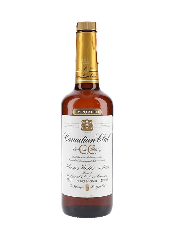 A bottle of Canadian Club whisky distilled and bottled by Hiram Walker & Sons Limited. The Canadian tax strip reads 1982. This indicates that the youngest whisky in the bottle was distilled in 1980s.
