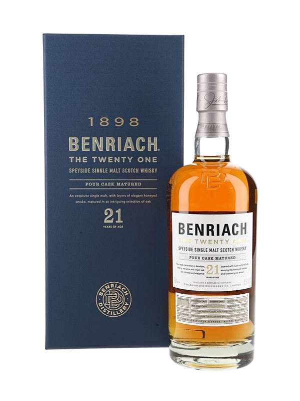 A bottle of Benriach 21 Year Old Single Malt Scotch Whisky. Matured in Bourbon, Virgin Oak, Sherry Oak and Red Wine casks and bottled in 2023.