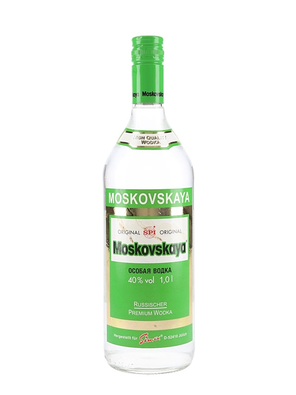 A litre bottle of Moskovskaya genuine Russian vodka.