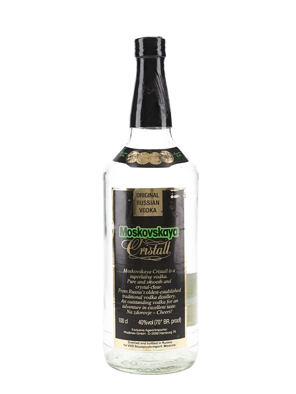 A litre bottle of Moskovskaya Cristal Russian vodka.