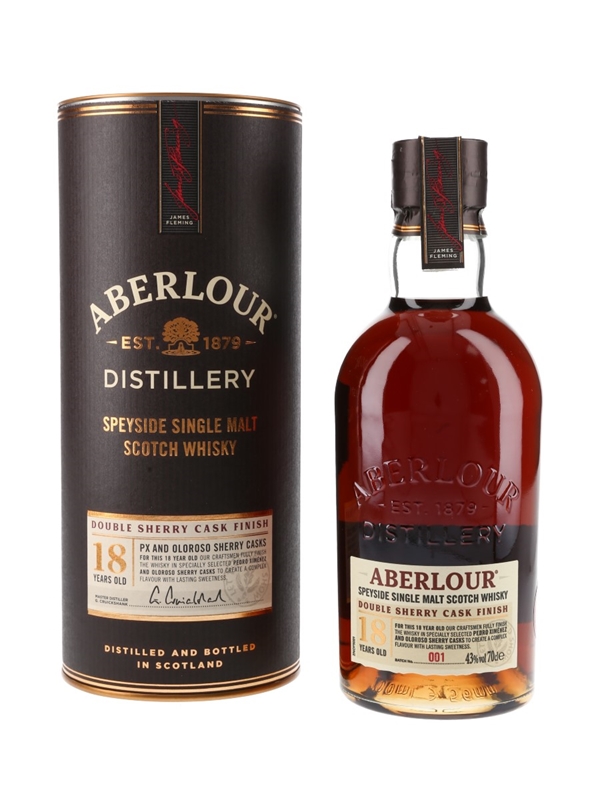 A bottle of Aberlour 18 Year Old Double Sherry Cask Finish Speyside Single Malt Scotch Whisky finished in Oloroso and Pedro Ximenez Sherry casks.