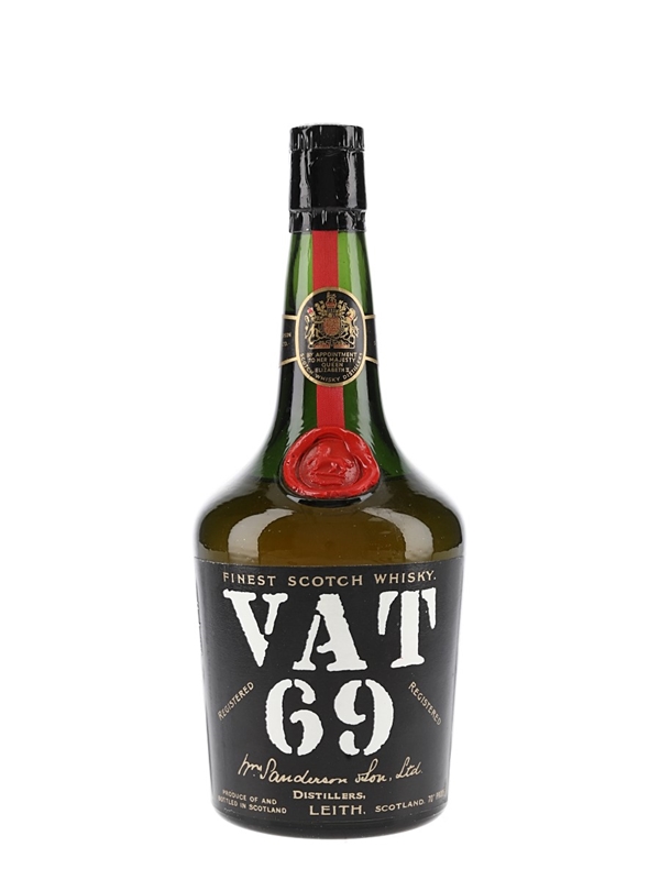 A bottle of Vat 69 Finest Scotch Whisky, produced by Wm Sanderson & Son Ltd. We estimate this was bottled in the 1960s.