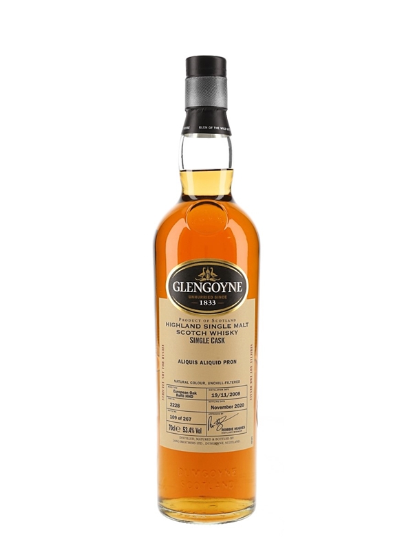 A bottle of Glengoyne 2008 Single Cask Aliquis Aliquid Pron Highland Single Malt Scotch Whisky. This was distilled on 19 November 2008, matured in a European sherry Hogshead and bottled in November 2020.