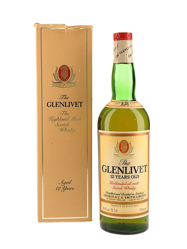A bottle of Glenlivet 12 Year Old Unblended All Malt Scotch whisky, distilled and bottled in Scotland by George & J G Smith Limited, The Glenlivet Distillery. We estimate this was bottled in the late 1970s.