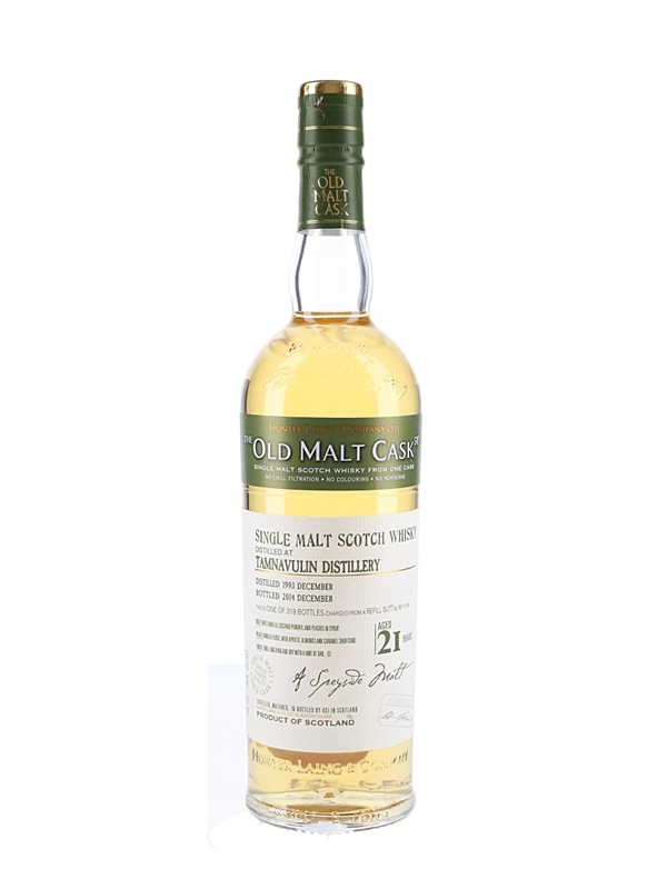 A bottle of Tamnavulin 21 Year Old Single Malt Scotch Whisky, bottled for Hunter Laing's Old Malt Cask range. This was distilled in December 1993, matured in a refill sherry butt and bottled in December 2014.